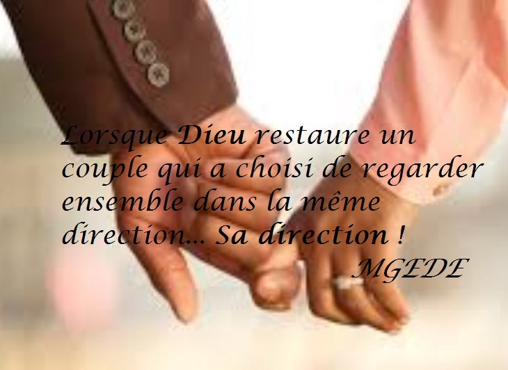 Françoise Memono Mbarga Ohhh ma Tulipe merci beaucoup beaucoup. Ton commentaire dit aussi ce que nous souhaitons faire passer comme message pour encourager d’autres, (pas conseiller, c’est si difficile en matiĂšre de couple) mais encourager oui car comme je le partage, j’en suis convaincue, Dieu nous console afin que nous consolions…Il restaure afin que nous montrions que c’est possible et que pour cela, Il suffit de Lui donner la place qui lui est due et Lui obĂ©ir…cela peut ĂȘtre long Ă nos yeux…parfois si douloureux…mais c’est ainsi qu’Il façonne au mieux!!! Merci beaucoup, Ă Nous Ensemble (Georges B. Dayas-Eyoum et moi) de demeurer dans la priĂšre et avec Lui, et cela est un travail quotidien qui ne peut se faire qu’Ă deux. @ Nathalie-Olivia Nja-kwa oui, il faut le vouloir Ă deux, sinon ce n’est pas possible Ă longue, c’est Ă©puisant et tout s’Ă©croule… Un combat quotidien, tant le mariage est combattu par le mal, par tous les moyens dont il dispose…Pourquoi? Parce qu’Il est d’une beautĂ© absolue…Celle qui ne vient que Dieu !!! Merci infiniment .Merci.Puissions-nous vous Ă©difier, vous encourager…Ă vous tourner les mains unies vers Notre PĂšre…Nous ne sommes que des instruments (d’amour je le souhaite du fond du cĆur) dont Il se sert, pour vous mener directement Ă Lui !!! Amen â€